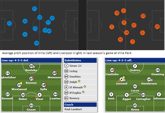 Here is how the teams lined up last April at Villa Park. Villa in blue, Liverpool in orange.