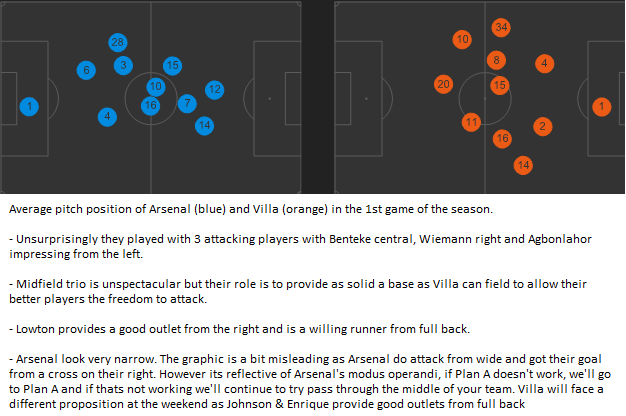 One aspect of Villa's play from last season was their desire to counter attack swiftly when they won the ball back or intercepted a pass. When a team has a midfield with the likes of Delph, Westwood, Sylla & Bannon and an attack with Benteke, Agbonlahor & Wiemann, its not surprising that they try get the ball to their attackers quickly rather than try recycle possession with average midfielders (as outlined already with the below average possession stats). However, they are also willing to push Lowton forward and Luna was not shy about attacking on his debut at Arsenal.