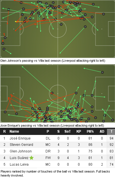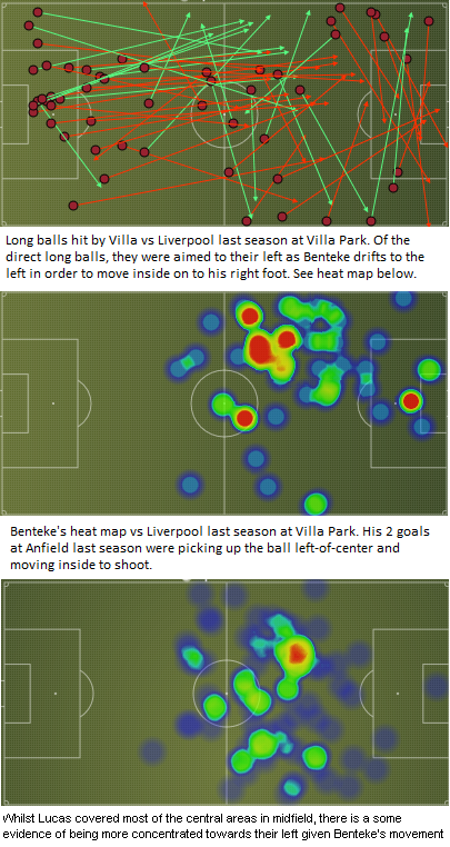 Below is a graphic of Villa's long balls against Liverpool at Villa Park. Not all were pure direct balls as seen by Stoke last season (not so much last week though) but of those direct balls from deep defence, they were aimed to their left. This is generally because Benteke operated from this side in last season's game. Lucas tried to negate this tactic by standing on Benteke's toes to try stop him pulling it down on his chest or make the flick on more difficult. Hopefully the same tactic is employed again by Liverpool. In that game, Lucas competed for 6 headers whereas Carragher and Johnson (who were on the right of defence competed for 4 between them, Agger actually competed for 11 !!). With Toure a willing competitor in the air and operating on the right, Benteke should not have it all his own way in the air if he is largely going to operate by drifting left of center.